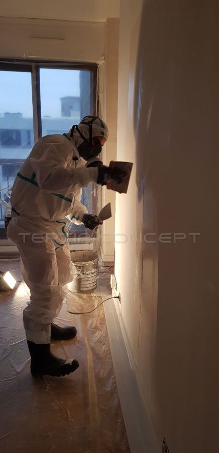 La typologie des travaux varie selon chaque chantier, ainsi nous appliquons les processus et les gestes professionnels adaptés à chaque opération. Sur ce chantier situé dans le sud de paris, nous avons réalisé la dépose de papier peint sur plâtre amianté, puis, le rebouchage des aspérités et la mise en œuvre de la peinture murale et plafond.