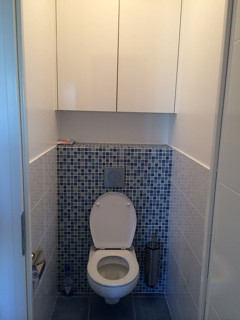 Dans le cadre de la rénovation complète d’un appartement de 65m², nous avons réalisé selon les souhaits des nouveaux résidents une salle de bains et des sanitaires pratiques, confortables avec une note esthétique.